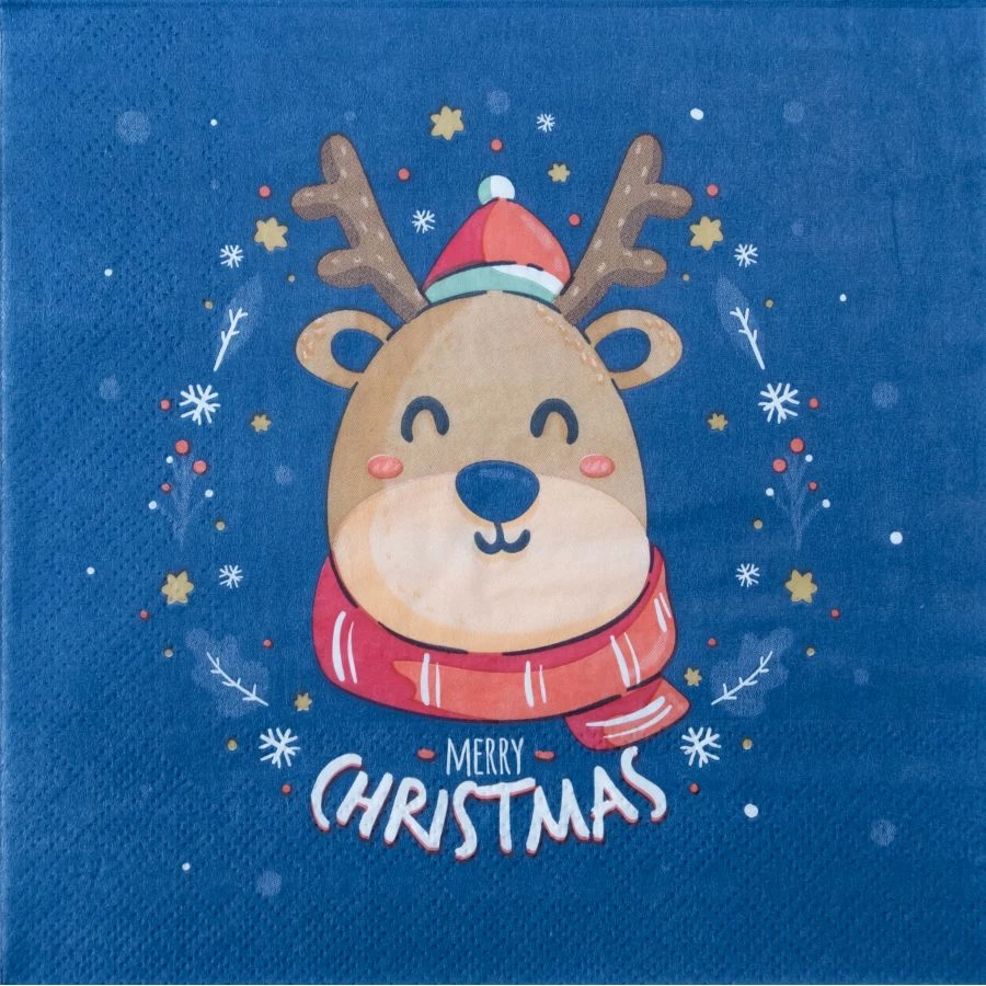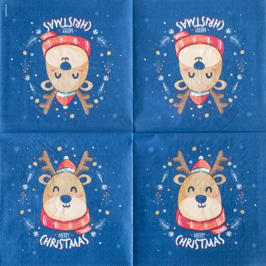 Un set di 20 graziosi tovaglioli blu intenso con una sorridente renna, super freddolosa indossa sciarpa e cuffietta natalizia, per un’elegante e adorabile decorazione della tavola di Natale.