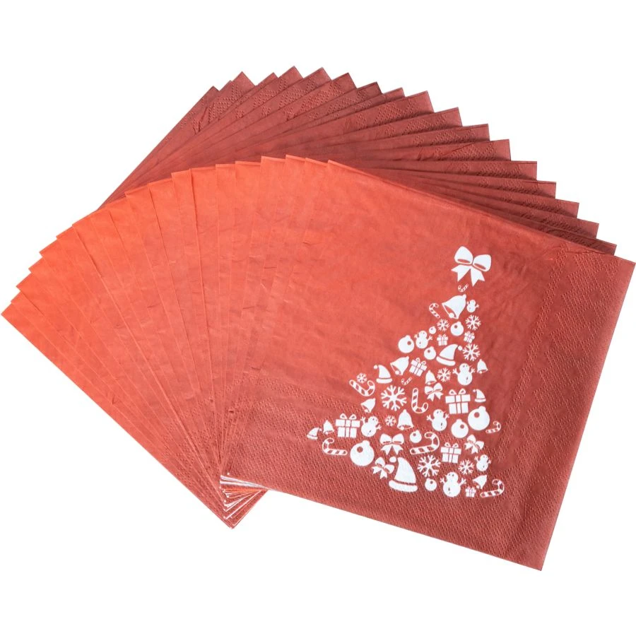 Un set di 20 tovaglioli color rosso, con la stampa di un albero di Natale formato da elementi tipici di natale: fiocchetti, campanelli, fiocchi di neve, palline di natale, pupazzi di neve, cappellini di Babbo Natale, bastoncini di zucchero…