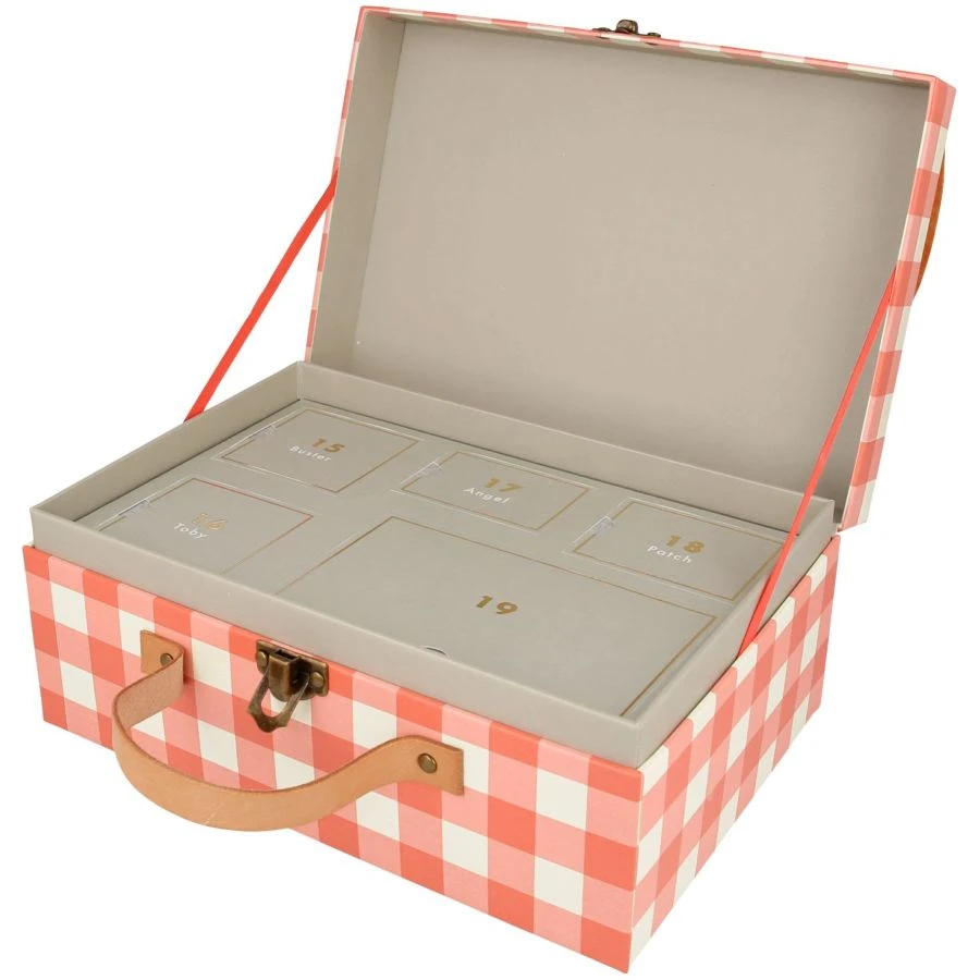 Un graziosissimo Calendario dell’avvento dei cani di Natale, presentato in una bella valigia a quadretti, che contiene dei bellissimi cagnolini!!!