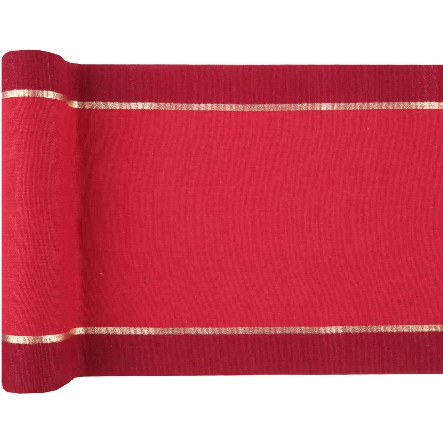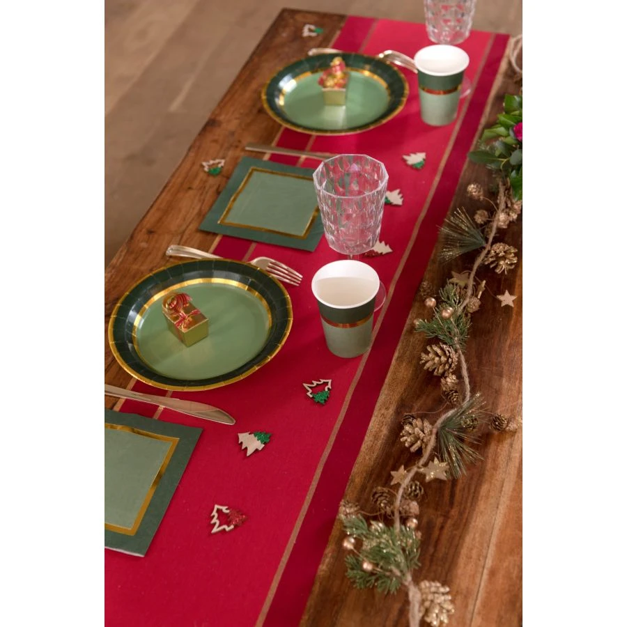 Un runner da tavola in cotone rosso con dettagli dorati, da completare con la gamma di stoviglie e decorazioni da tavola abbinate, per comporre una tavola di Natale chic!