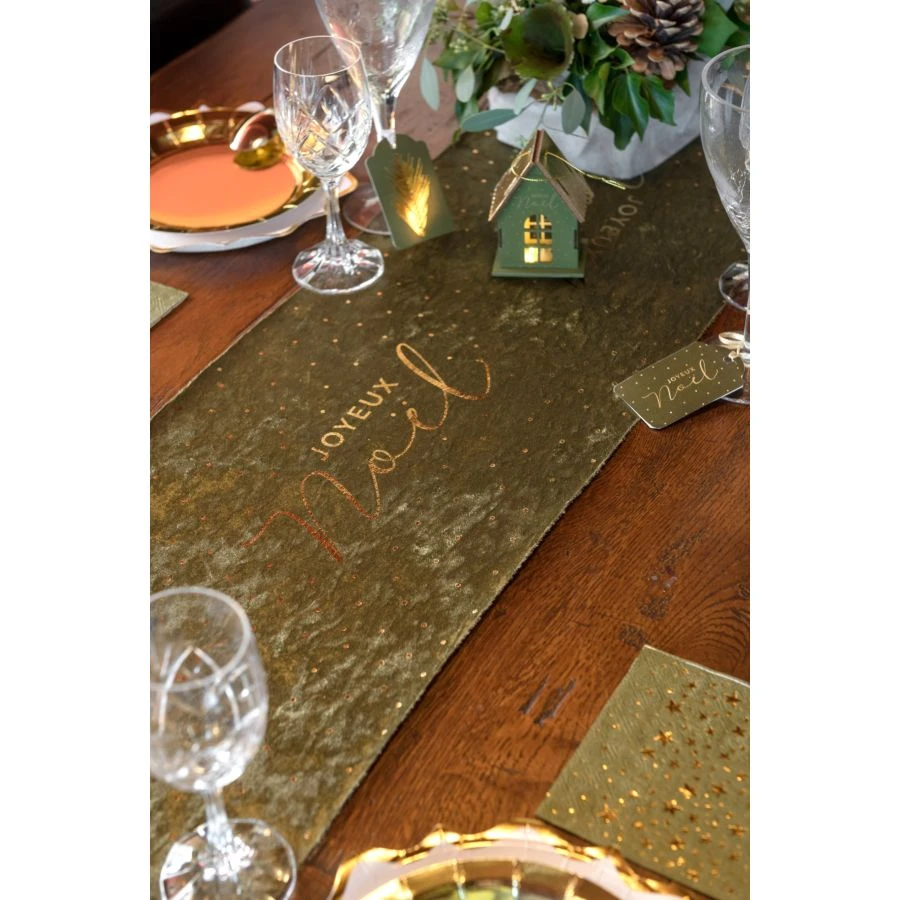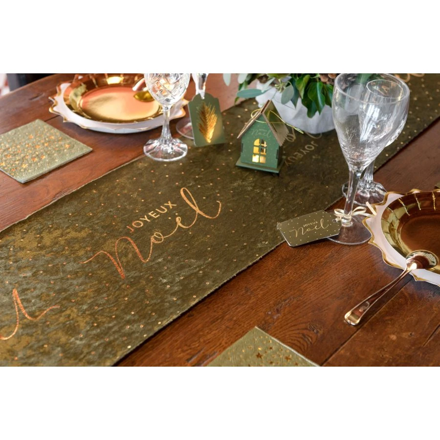 Un elegantissimo e morbido sfondo in velluto verde decorato con pois dorati e un augurio di Natale. Da completare con le stoviglie, le tovaglie e le decorazioni da tavola abbinate, per comporre una tavola di Natale chic e festosa!